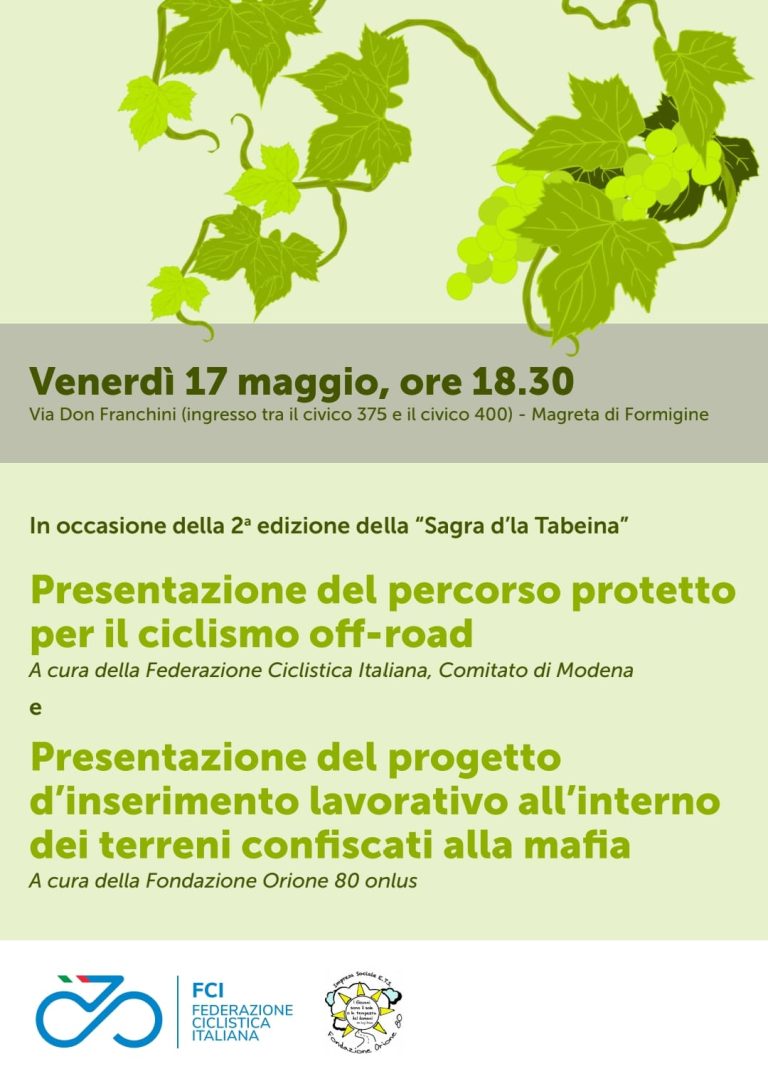 Venerdì 17 maggio alle ore 18.30 sarà presentato nell’ambito della Sagra di Tabina (Magreta di Formigine) lo sviluppo del progetto realizzato dal Comune di Formigine sui terreni confiscati alla criminalità organizzata.
